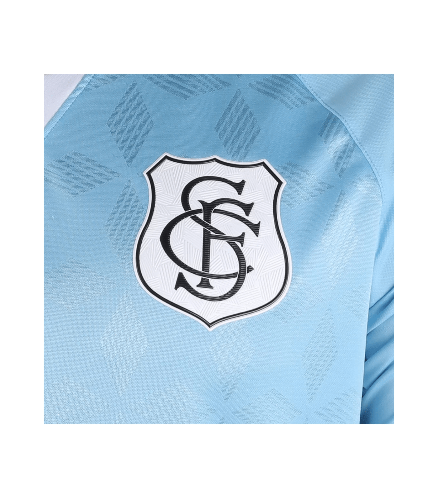 O design dessa camiseta é icônico e marcante. A cor azul claro predominante transmite elegância e destaca o escudo do Santos, que está posicionado no lado esquerdo do peito. Detalhes em preto, como a logomarca da Umbro, completam o visual autêntico.