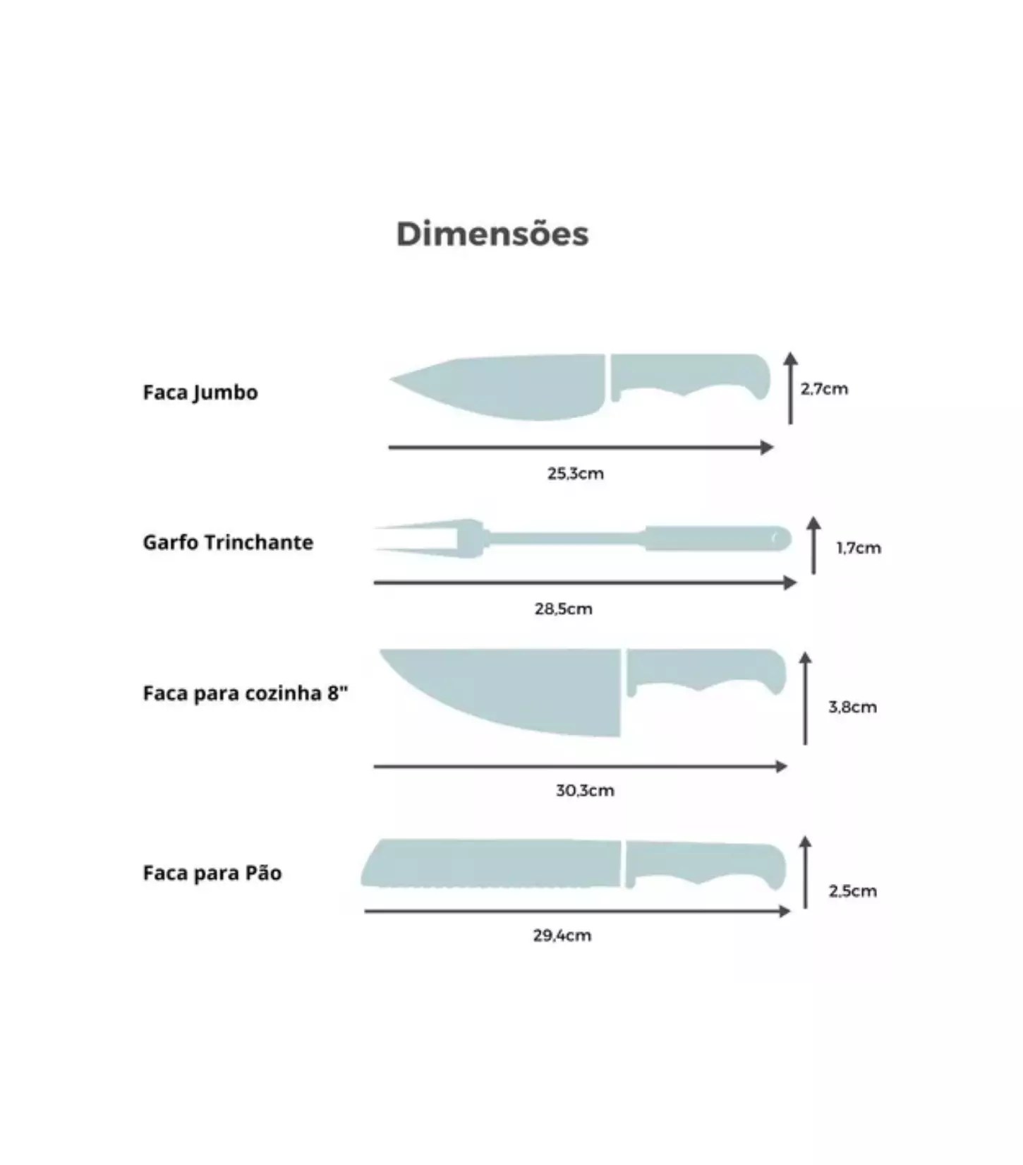 O conjunto inclui uma faca jumbo, um garfo trinchante resistente, uma faca para churrasco afiada e uma faca com serra perfeita para cortar pão. Cada uma dessas peças é projetada ergonomicamente, permitindo um manuseio fácil e eficiente, para que você possa preparar e servir suas carnes favoritas com perfeição.